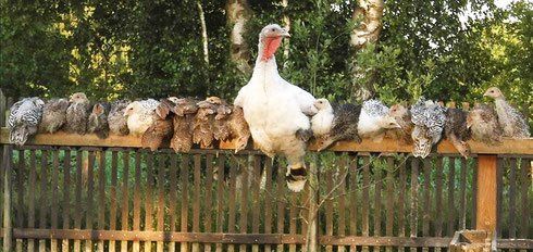 Die Putenmama samt Nachwuchs genießen die Sonne an ihrer Gartenbar.