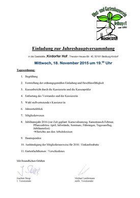 Einladung zur Jahreshauptversammlung in der AWO-Begegnungsstätte Hubert Klemmer Haus Gustav-Heinemann-Str. 2, 50181 Bedburg Mittwoch, den 07.05.2025 um 18:00 Uhr Tagesordnung: 1. Begrüßung 2. Feststellung der ordnungsgemäßen Einladung 3. Fragen zur Tagesordnung 4. Kassenbericht durch den Kassierer und Kassenprüfer/in 5. Entlastung des Vorstandes 6. Turnusmäßige Neuwahl eines Kassenprüfers 7. Entwicklung Mitgliederwesen 8. Berichte über Aktivitäten 2024 bis heute 9. Weitere Planungen 2025 10. Verschiedenes Um besser planen zu können, bitten wir um eine Zusage bis zum 02.05.2025 per Mail an info@obst-und-gartenbauverein-bedburg.de oder an George Brings 02272 7622 oder Alfred Ladenthin 0162 3220326 Mit freundlichen Grüßen Alfred Ladenthin