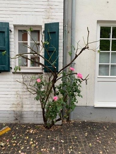 Die im letzten Jahr begonnene Verjüngung des wunderschönen Rosenstrauchs in Alt-Kaster sollte in diesem Jahr fortgesetzt werden. Allerdings hatte es im zeitigen Frühjahr mit dem alljährlichen Rückschnitt nicht geklappt, so dass nur noch die Möglichkeit blieb, den Rückschnitt trotz der bereits begonnenen Blüte durchzuführen.